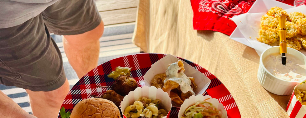 plaid plates; Home Depot, bamboo cutlery; Walmart, wicker placemats; Homegoods, table runner; Amazon, vase bandanas; Hobby Lobby, mason jars; grocer, mason jar mugs; Michaels, lanterns, bandana pillow covers & pinwheels; Amazon, flag and star pillows no longer available, all photos; randiklifestyleblog.com, book; "Tiny Food Party, bite-size recipes for miniature meals" by Teri Lyn Fisher & Jenny Park, The Best Baked Beans Recipe; Home With Holly J, recipe; "Creamy Ranch Coleslaw" Recipe from "Garlic and Olive Oil Veins" , "Mini Puff Pastry Apple Pie", A Peachy Plate, mini serving cups; Amazon & Michaels, Old Fashioned Lemonade Recipe; Persnickety Plates, crates found at Michaels