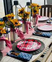 I painted mason jars from my grocery store, and tied a checkered bandanas around them for that "down home feel". I love how they turned out, and the sunflowers really pop against the red, white and blue palette!
