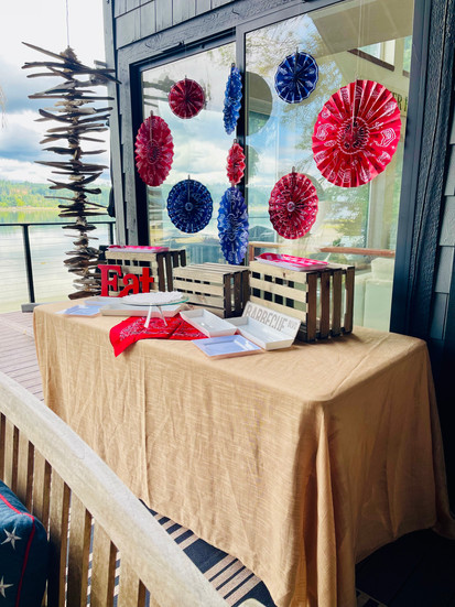 Planning ahead, I found odds and ends to use for the buffet table decorations. Peeking around Pinterest for buffet table ideas, I discovered many tables have food served at different heights for interest. So I rummaged through my garage, and found crates I used in my trade shows. They are perfect for elevating my BBQ menu items. Some of the serving trays I had from past cookouts, and others I purchased online. My grocery store had the cute gingham trays in there seasonal section! You just never know what will catch your eye!