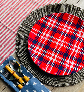 When planning your table remember to incorporate many patterns that relate to one another. I chose red, white and blue for an "Americana" feel for my July BBQ. Plaids, stripes, and stars all work together! My challenge was to create a reasonable, but stylish table setting.